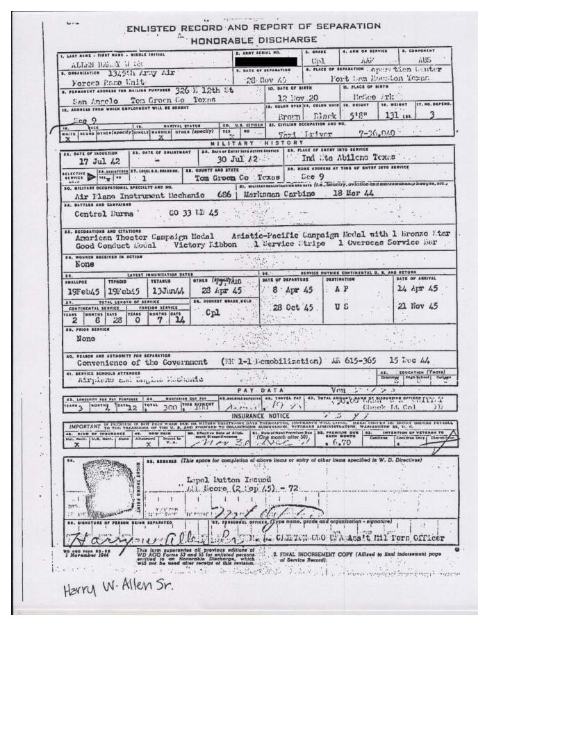 For Harry W. Allen Sr., the surviving discharge paper preserves the outline of a World War II story shaped by duty, machinery, distance, and war on a global scale. The document shows service in the Army of the United States, in the Army Air Forces, at a time when America’s wartime air arm was carrying men, machines, and supplies across some of the hardest terrain and most dangerous routes in the world. It shows that Harry W. Allen Sr. held the rank of Corporal, served as an Airplane Instrument Mechanic, and took part in the Central Burma campaign before his separation in November 1945.