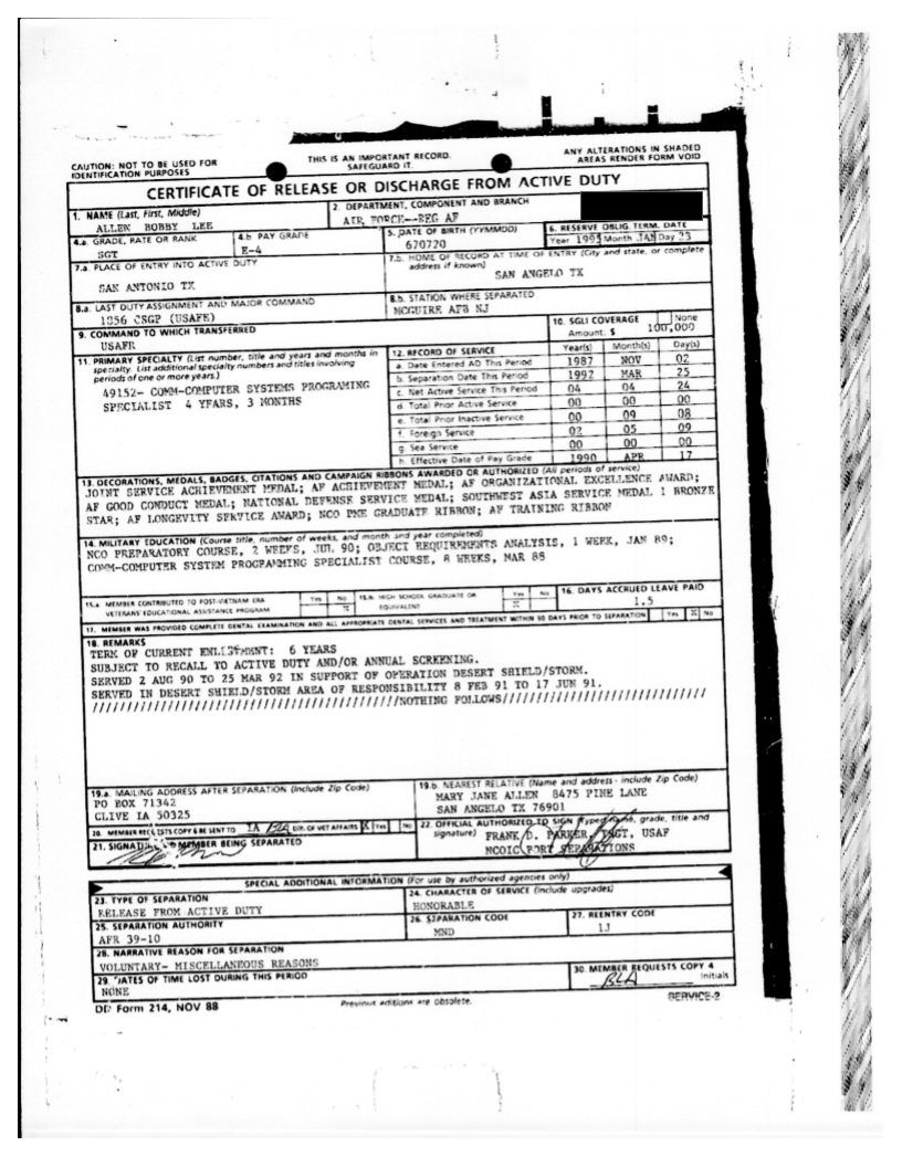 For Bobby Lee Allen, the surviving official summary is a DD-214: a document of dates, duty, rank, training, overseas service, awards, and discharge status. On paper, it is concise. In meaning, it is much larger. It shows that Bobby Lee Allen served honorably in the United States Air Force from November 2, 1987, to March 25, 1992, during a period that spanned the final years of the Cold War and the opening of the Gulf War era. It shows that he worked in a demanding technical specialty, served overseas, supported Operation Desert Shield and Operation Desert Storm, and completed his active-duty career with an Honorable discharge.