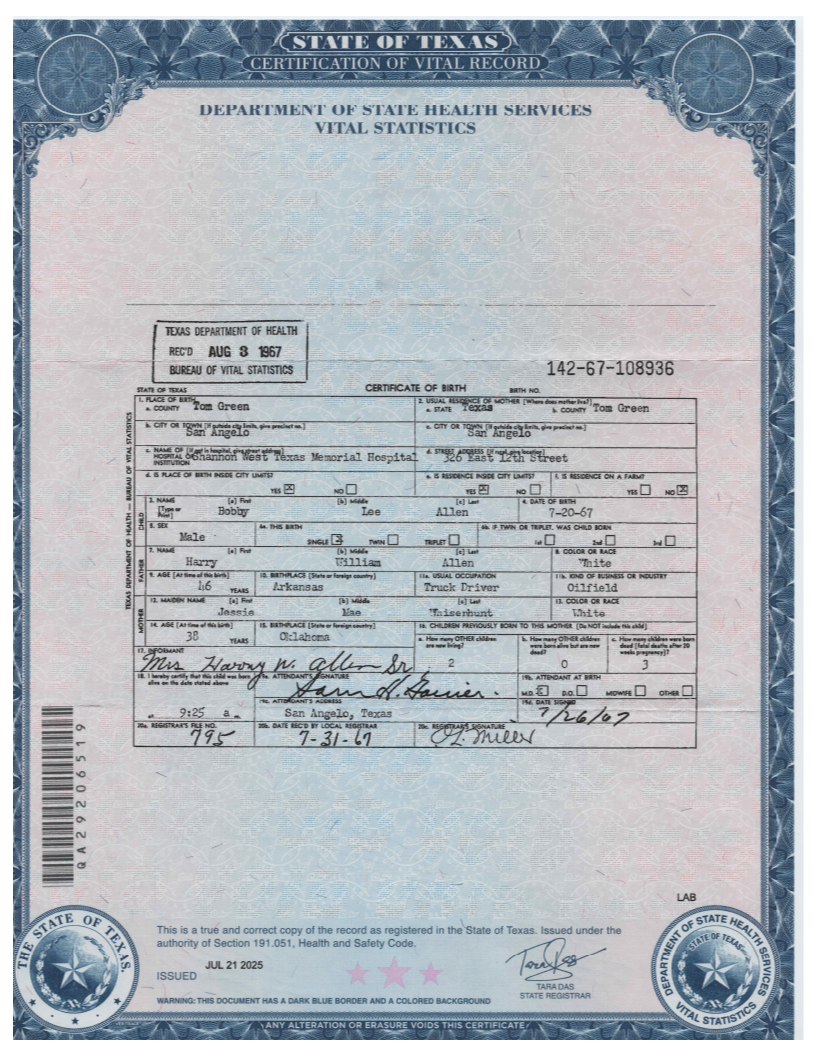 As you can see I was born on July the 20th 1967 at Shannon West Texas Memorial Hospital, Texas, Tom Green County, San Angelo Texas.